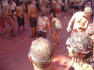 Spain has become somewhat known for crazy festivals between this and the Running of the Bulls. La Tomatina is a large food fight using tomatoes. It takes place in Buñol which only has 9,000 residents, but nearly 40,000 people gather there each year for la Tomatina. While the tomato fight, considered the largest food fight in the world, is the most popular event, the entire festival actually lasts a week with parties, music, dancing and fireworks. It culminates with the tomato battle which takes place the last Wednesday of August.