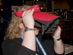 The hat holds an iPod or other device in a drop down section off of the brim, and covers the sides to make it dark. That means you can watch videos from the device from the hat. I guess that is one way to pass the time while waiting at the doctor’s office.